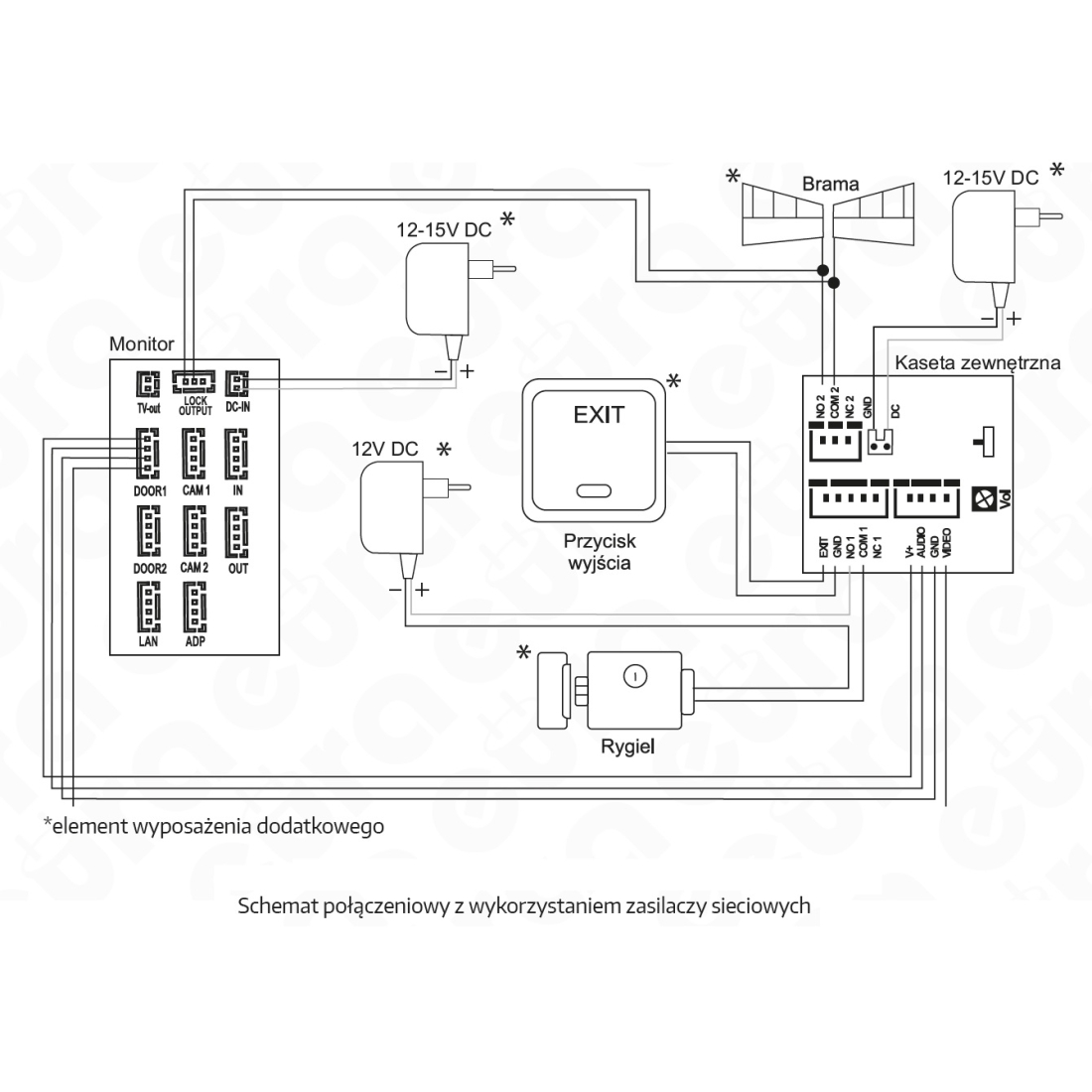 Wideodomofon pozwala na rozbudowę o dodatkową kasetę zewnętrzną, 5 monitorów podrzędnych (slave) oraz o 2 kamery IC-00C5 (patrz tabela kompatybilności).