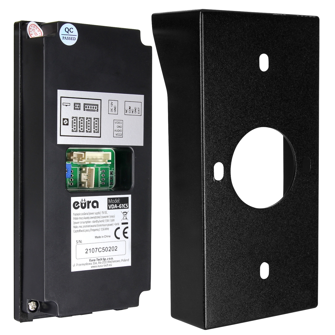 Montowana natynkowo kaseta zewnętrzna VDA-61C5 idealnie mieści się na wąskim słupku. Wykonana jest ze stopu aluminium i jest odporna na opady atmosferyczne (stopień ochrony – IP65). Kasetę wyposażono w kamerę posiadającą obraz w rozdzielczości Full HD 1080p, z obiektywem o poziomym polu widzenia 110º i pionowym 60º. Wejście na posesje może być realizowane za pomocą czytnika zbliżeniowego obsługującego breloki i karty pracującego w standardzie Mifare 13,56 MHz. Dodatkowo kaseta zewnętrzna posiada podczerwone oświetlenie nocne.