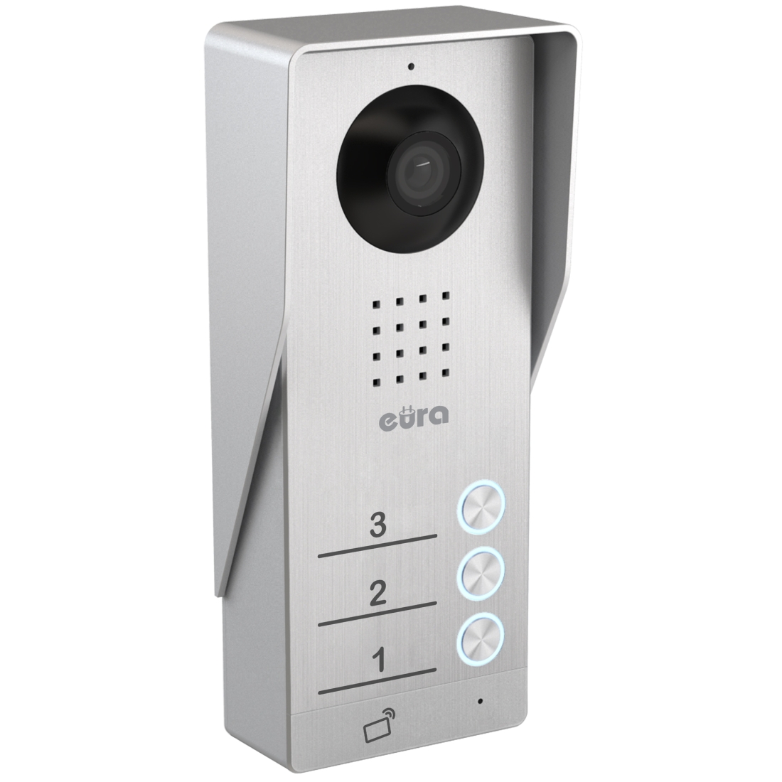 Trójrodzinna kaseta zewnętrzna Eura VDA-93A3 wyposażona jest w 6 diód LED oraz czujnik zmierzchowy, co umożliwia dyskretny podgląd w nocy. Kasetę wyposażono w kamerę rejestrującą obraz w rozdzielczości 500 TVL z obiektywem o polu widzenia 60°. Wejście na posesje może być realizowane za pomocą breloków zbliżeniowych. Kaseta zewnętrzna wykonana jest ze stopu aluminium co wraz z daszkiem ochronnym zapewnia jej odporność na niekorzystne warunki atmosferyczne. Przeznaczona do montażu natynkowego.
