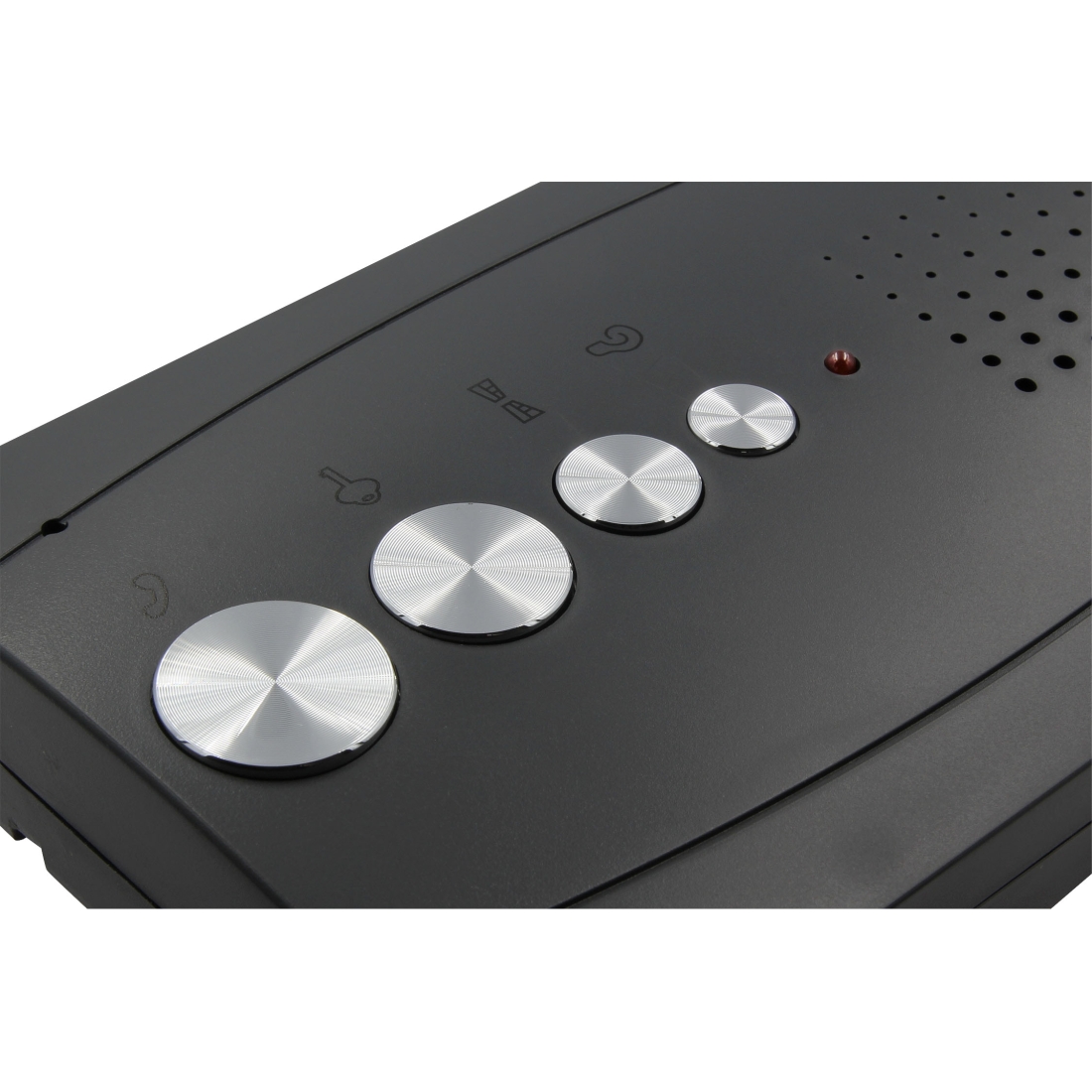 Domofon czterorodzinny - Eura ADP-64A3, wyposażony jest w cztery grafitowe unifony głośnomówiące, kasetę zewnętrzną ze wbudowanym czytnikiem kluczy zbliżeniowych, oraz zasilacz na szynę DIN 12V DC 4,5A.