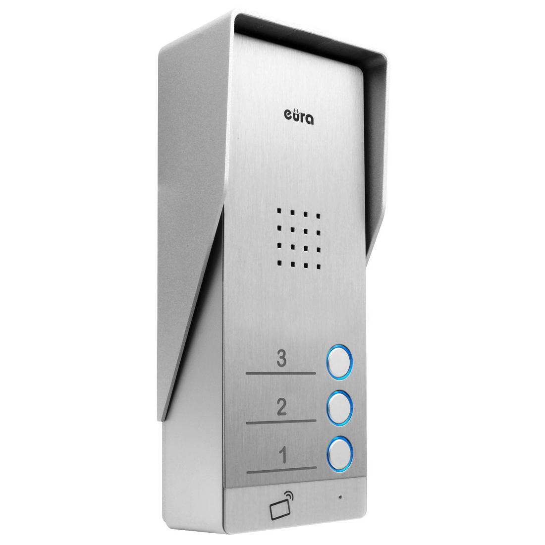 Domofon trójrodzinny - Eura ADP-63A3, wyposażony jest w trzy białe unifony głośnomówiące, kasetę zewnętrzną ze wbudowanym czytnikiem kluczy zbliżeniowych, oraz zasilacz na szynę DIN 12V DC 4,5A.