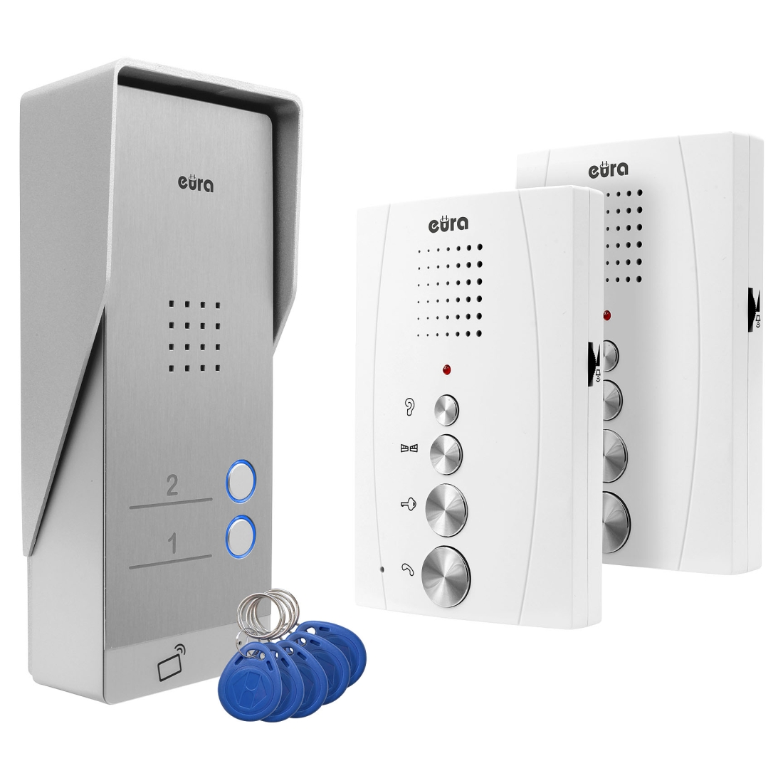 Domofon dwurodzinny - Eura ADP-62A3, wyposażony jest w dwa białe unifony głośnomówiące, kasetę zewnętrzną ze wbudowanym czytnikiem kluczy zbliżeniowych, oraz komplet zasilaczy sieciowych 12V DC.