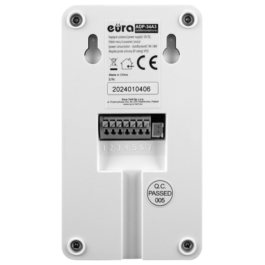 DOMOFON "EURA" ADP-34A3 - biały, jednorodzinny, głośnomówiący, obsługa 2 wejść, szyfrator, czytnik zbliżeniowy